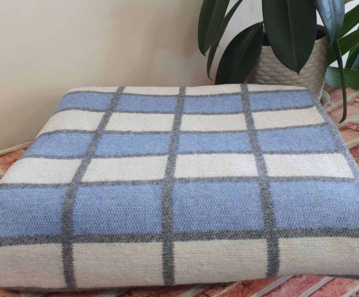 Одеяло байковое 140*205 - 80% хлопка бело-темно серая клетка с синим