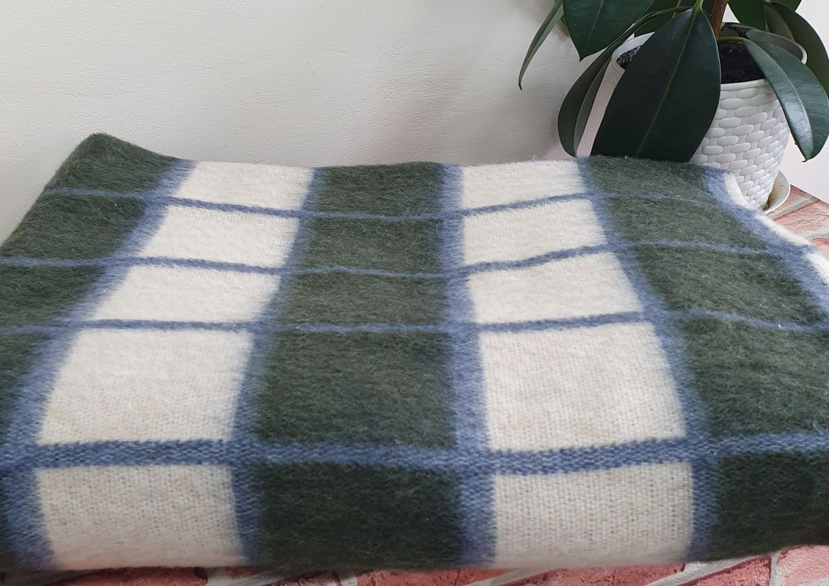 Одеяло шерстяное 50% 140*205 - Сине-песочная клетка с зеленым О-1