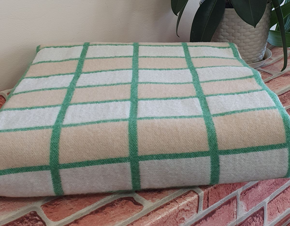 Одеяло байковое 140*205 - 80% хлопка бело-песочно-зеленая клетка