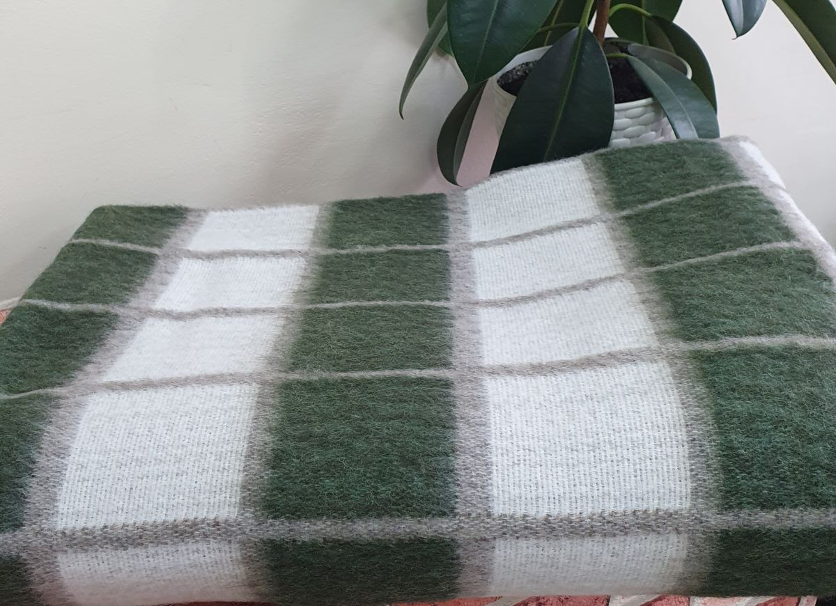 Одеяло шерстяное 50% 140*205 - Бело-зелено-бежевая клетка О-1