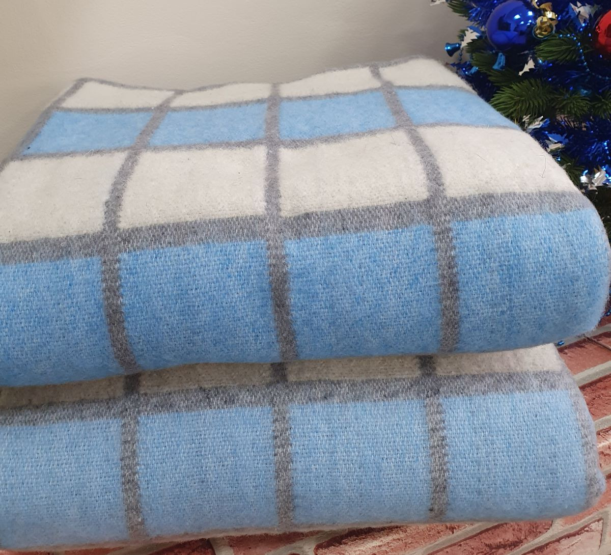 Одеяло шерстяное 50% 140*205 - Бело-серо-ярко-голубая клетка 1О-1